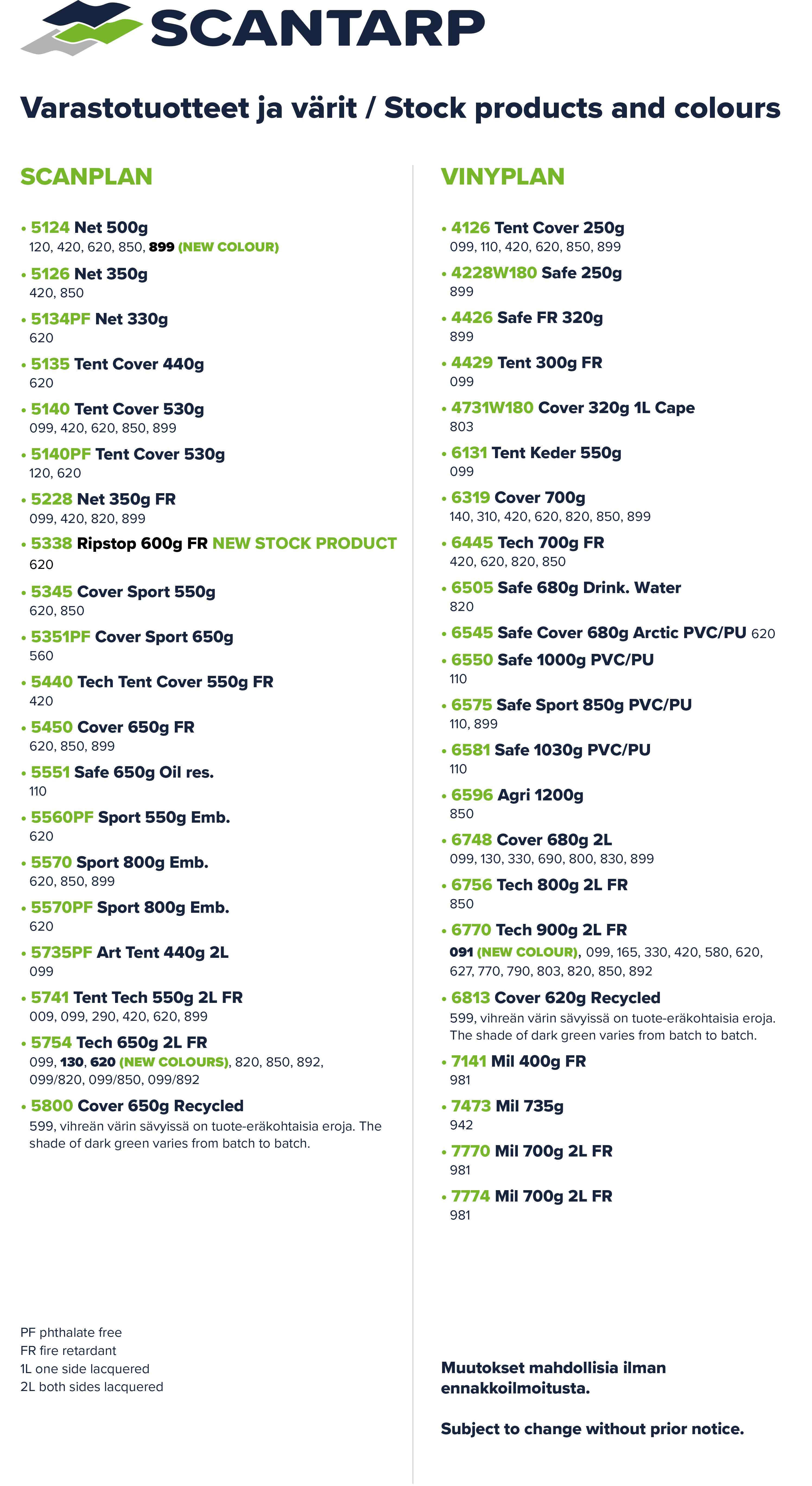 Varastomme yli sata erilaista kangaslaatua jopa 30 värivaihtoehdossa takaavat nopean toimituksen. Tutustu valikoimaamme ja ota meihin yhteyttä sähköpostitse sales@scantarp.fi. Lähetämme mielellämme myös tuotenäytteitä ja lisätietoja tuotteistamme.